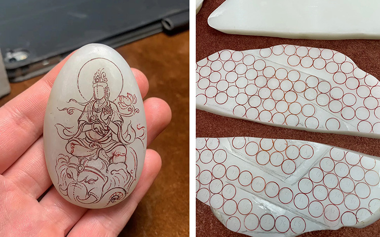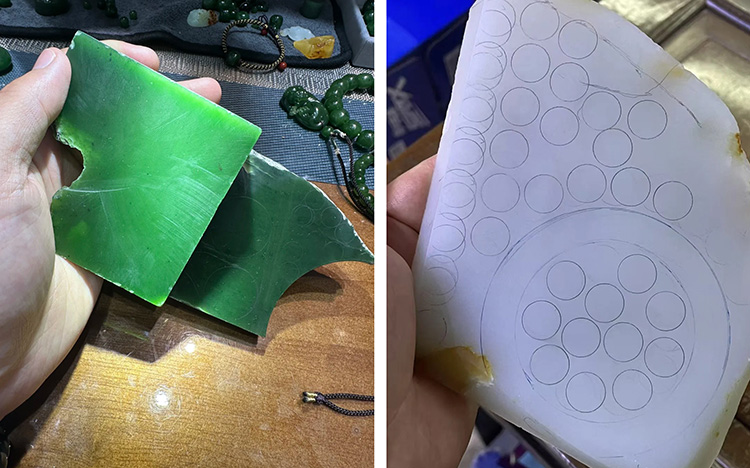 拿货主体多为资深料商、玉雕工作室,他们凭经验判断毛料价值并收购,后续分两种走向:多数毛料在行业内层层转卖,只倒手不加工,转手次数越多价格越高;少数实力商家会自主切料、设计、加工,这其中存在“赌料”风险——切得好料质翻倍,切垮则面临亏损,这也是和田玉行业的核心特点。