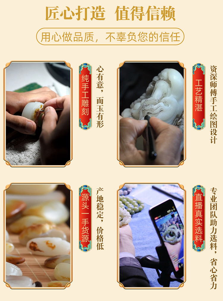 我们坚持做真正的和田玉一手货源,从原石甄选到成品雕琢全流程自主把控,父亲和团队常年奔走在新疆、石佛寺、广州等料源地和加工地,只为挑选优质毛料;原料到手后,由我亲自设计加工,省去所有中间加价环节。做和田玉,拼的是用心和专业——选料靠眼光,设计靠审美,加工靠工艺,容不得半点敷衍。
